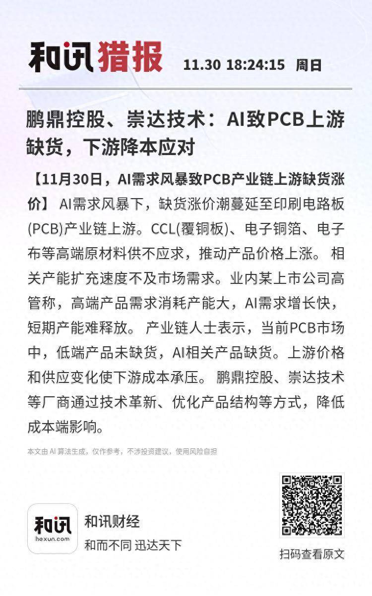 【11月30日,AI需求风暴致PCB产业链上游缺货涨价】AI需求风暴下,缺货涨价潮蔓延至印刷电路板(PCB)产业链上游。CCL(覆铜板)、电子铜箔、电子布等高端原材料供不应求,推动产品价格上涨。相关产能扩充速度不及市场需求。业内某上市公司高管称,高端产品需求消耗产能大,AI需求增长快,短期产能难释放。产业链人士表示,当前PCB市场中,低端产品未缺货,AI相关产品缺货。上游价格和供应变化使下游成本承压。鹏鼎控股、崇达技术等厂商通过技术革新、优化产品结构等方式,降低成本端影响。