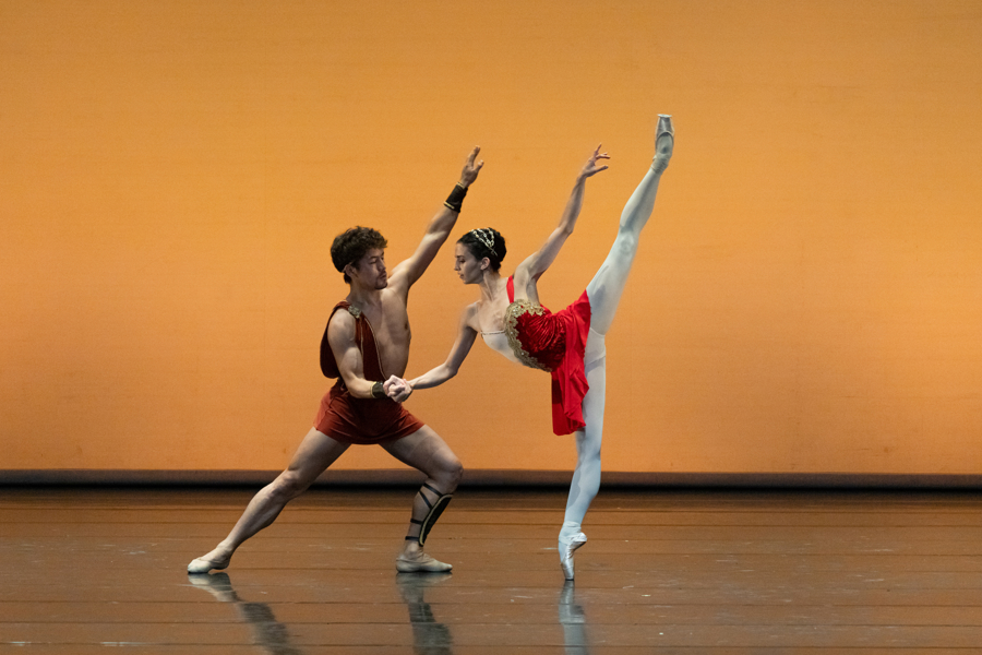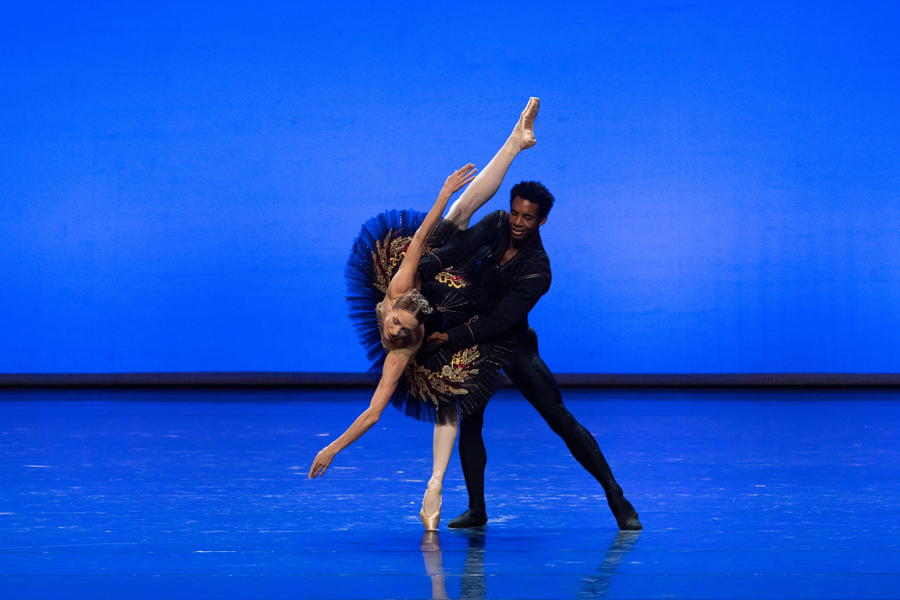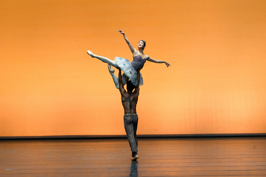菅井圆加与奥西尔·古尼奥共同演绎的《海盗》双人舞拉开序幕,力量与美感交织,率先点燃现场气氛。阿丽娜与马修·加尼奥以纯净线条诠释“钻石”双人舞的新古典气质,在《茶花女》“黑色”双人舞中收束节奏与情绪,展现情感裂变的细腻层次,独舞《贰》则以身体探索光影的边界。巴赫蒂亚尔·阿达姆詹与比安卡·特谢拉在《斯巴达克斯》中细腻勾勒英雄与爱人的深情凝望,在《戴安娜与阿克顿》中再以奔放动势与强劲能量获得满场喝彩。克谢尼娅·奥夫夏尼克在“黑天鹅”双人舞中以精准的32个挥鞭转掀起全场高潮;约翰·科博格在《ABC》中以诙谐身段打破传统语法,为舞台注入一抹轻松与灵动。