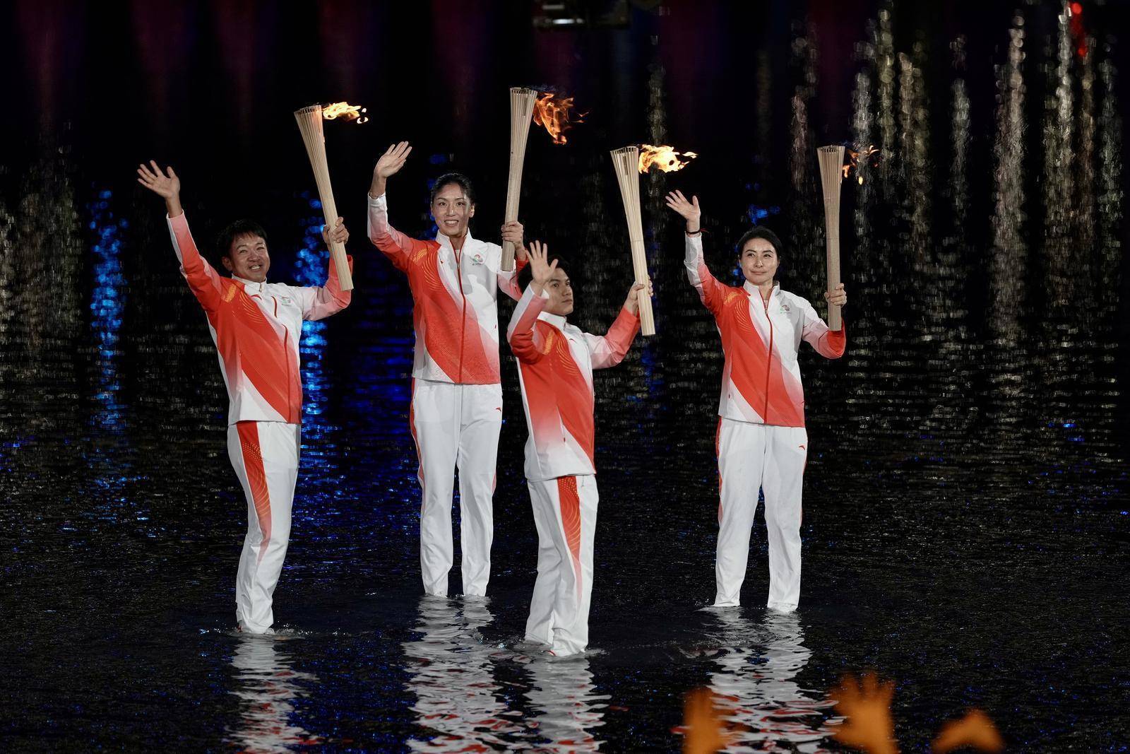 开幕式以“圆梦未来”为主题,通过“同根同源、同心同缘、同梦同圆”三大篇章呈现。主火炬台最终由男子100米亚洲纪录保持者、广东运动员苏炳添,奥运会男子花剑金牌得主、香港运动员张家朗,第19届亚运会武术长拳金牌获得者、澳门运动员李祎共同点燃。